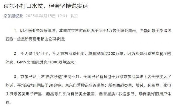 京东官方微信号“京东黑板报”今日(15日)发文称,“因秒送业务发展迅速,本季度京东将再招收不低于5万名全职外卖员,全额足额全部缴纳五险一金且所有费用都由公司承担”。此外,京东表示,“今天京东品质外卖订单量将超过500万单”。