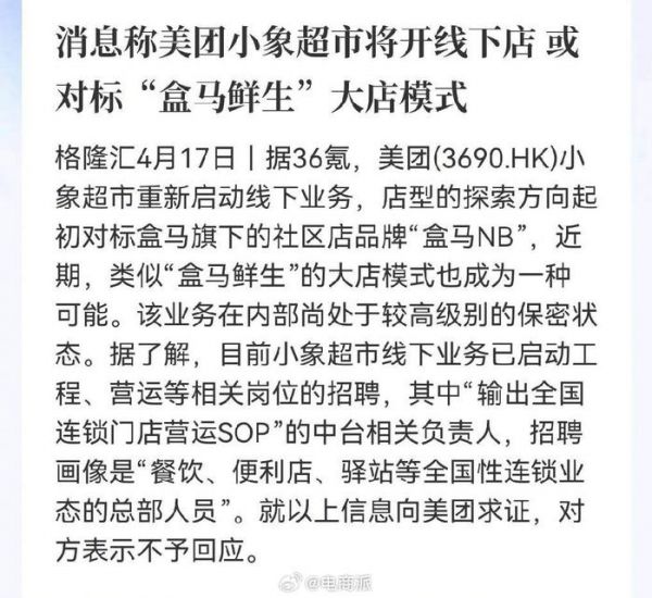 美团小象超市将线下开店,美团或将对标盒马鲜生线下店