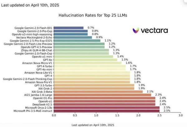 声誉良好的Vectara在2025年3月对目前市场上主流的AI大模型测试发现,大部分主流大模型产品的幻觉率大都处于一个较低的水平, Gemini-2.0-Flash-001,以0.7%的低幻觉率位居榜首,显示出其在处理文档时几乎没有引入虚假信息。此外,Gemini-2.0-Pro-Exp 和 OpenAI 的 o3-mini-high-reasoning 模型分别以0.8%的幻觉率紧随其后。