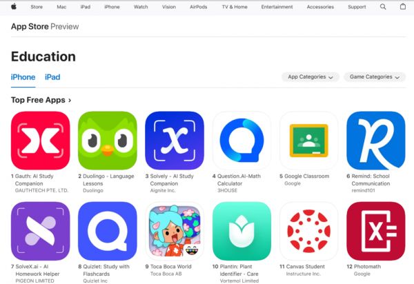 针对海外市场,作业帮打造的海外AI应用产品 Question.AI,在北美、东南亚等地同样广受欢迎,迅速适应并满足了当地用户的需求。美国苹果 App Store教育排行榜显示,Question.AI的下载量已经连续一年稳居前五之列,并取得过第一的成绩。Question.AI在谷歌Play Store也同样位居前列。