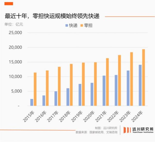 事实也是如此,快递在2021年才勉强突破万亿,而零担快运则早在2015年来到1.1万亿,目前则正在向着2万亿发起冲刺。