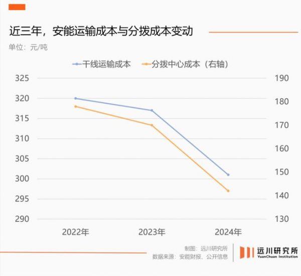 行业龙头安能的财报完美呈现了这一点,在“聚焦有效规模增长”战略下,得益于优化分拨结构、拉直干线,提高人车场效率,推动成本持续节降。同样是发一车货,2024年的运输成本、分拨成本仅为301元/吨、102元/吨,同比降幅分别5%和16.5%。
