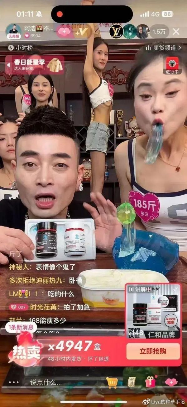 作为一个美食博主,阿浩平时的直播内容就是把各种美食送进嘴里,同时,阿浩还带货减肥产品,即“仁和左旋肉碱”减肥药。