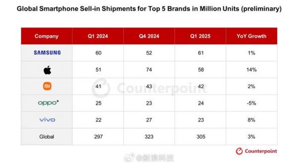 【CounterPoint:#中国成全球智能手机销量主要推力#,#iPhone第一季度出货量大增14%#、小米增2%】市场调查机构 Counterpoint Research 昨日(4 月 16 日)发布博文,报道称 2025 年第 1 季度全球智能手机出货量同比增长 3%,中国、拉丁美洲和东南亚市场的需求激增成为主要推动力。