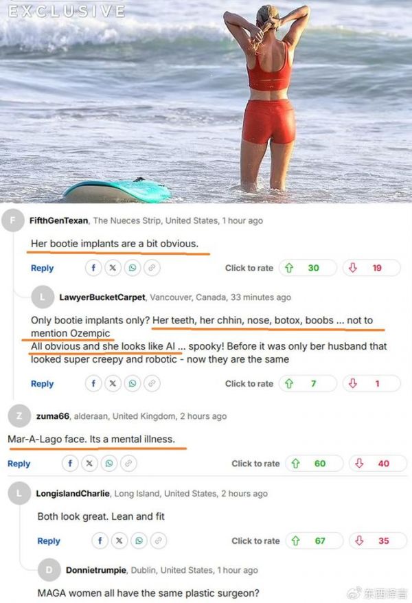 “她的臀部植入物有些明显,”一位美国得克萨斯州网友这样写道,随即一位加拿大网友回应称:“只有臀部植入物吗?她的牙齿、下巴、鼻子、肉毒杆菌、胸部……更别提司美格鲁肽了。这一切都显而易见,她看上去像人工智能……真吓人。之前只有她的丈夫像个机器人,现在他们都是。”