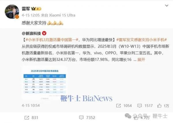 4月15日,雷军转发了“小米手机3月激活量中国第一”的报道,并发文表示,感谢大家支持。