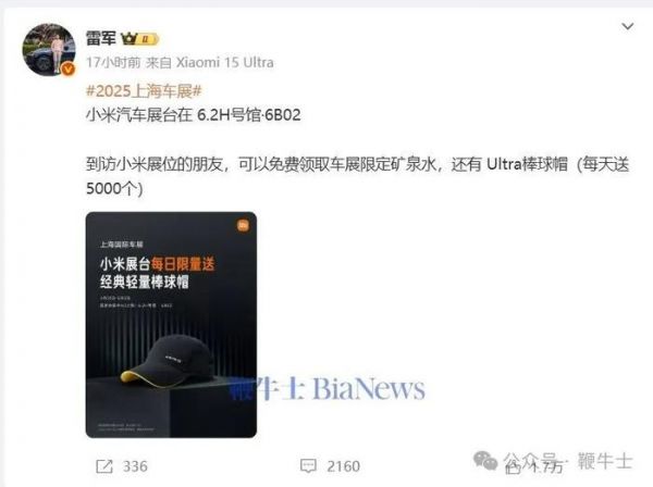 4月18日,雷军发文称,2025上海车展,小米汽车展台在6.2H号馆·6B02,到访小米展位的朋友,可以免费领取车展限定矿泉水,还有Ultra棒球帽(每天送5000个) 。
