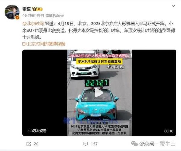 4月19日,雷军发文称,北京时间报道:4月19日,北京,2025北京亦庄人形机器人半马正式开跑,小米SU7也现身比赛赛道,化身为本次马拉松的计时车,车顶安装计时器的造型显得十分酷飒。