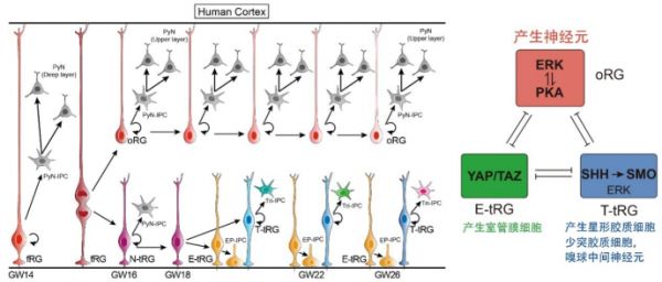 如果截短型放射状胶质细胞(tRGs)需要产生TRI-IPCs,进而产生大脑皮质的星形胶质细胞,少突胶质细胞和迁移到嗅球的中间神经元,则需要上调SHH信号通路。而SHH信号通路反过来抑制PKA, ERK,和YAP通路,确保此类tRGs不再产生皮质锥体神经元或者室管膜细胞。