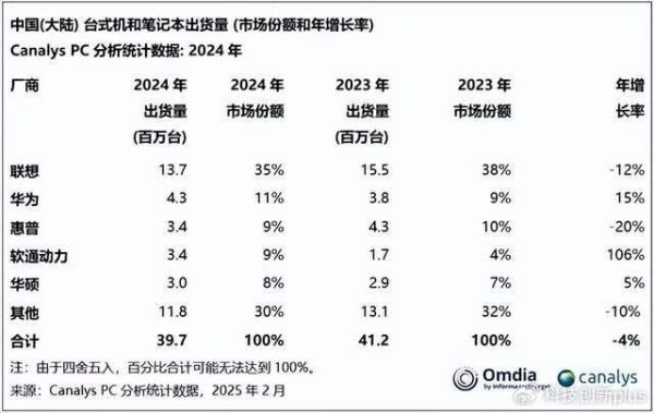 前段时间, Canalys 发布了2024年中国大陆 PC 市场报告,数据显示,2024年中国PC市场总出货量为3970万台,相较于去年下滑了4%。