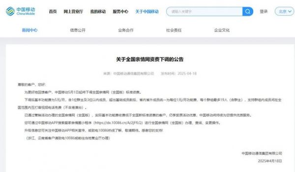 日前,中国移动发布公告称,5月1日起将下调全国亲情网(全国版)标准资费。下调后基本功能费为5元/月,含1位群主及3位以内成员,超出基础成员数后,省内省外成员统一为每位1元/月功能费,每个群组最多19人(含群主),支持群组内成员间在全国范围内互打音视频电话免费(不含港澳台)。
