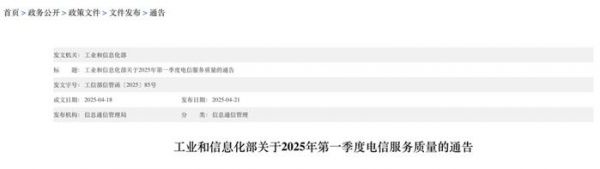 4月21日消息,工业和信息化部发布了2025年第一季度电信服务质量的通告。