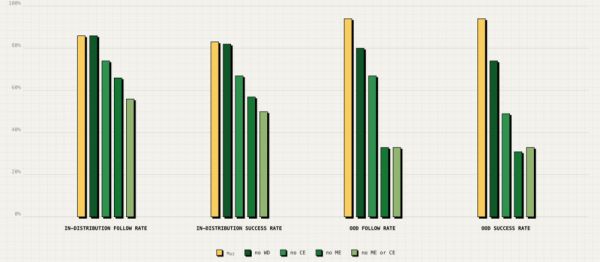 他们评估了两种实验条件:全面清洁任务;以及分布外泛化(OOD)评估,要求机器人将提示中指示的特定物体移入抽屉。对于这两种评估,都测量了成功率和语言理解率。在所有情况下,来自其他机器人(ME 和 CE)的数据对策略性能产生了巨大影响。在 OOD 案例中,他们还发现与包含网络数据(WD)的策略性能存在差异,这提高了机器人正确识别数据中未包含的新物体类别的能力。