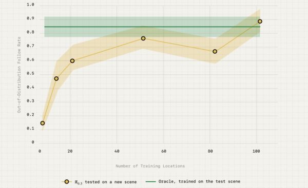 这些结果不仅表明,π0.5 的泛化性能会随着训练集中不同环境数量的增加而稳步提升,而且仅仅经过大约 100 个训练环境,它的性能就接近了直接在测试环境中训练的基线模型。