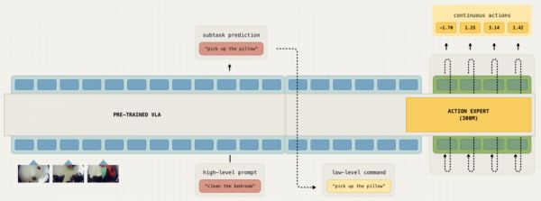 图|π0.5 使用的高层/低层推理程序。该模型首先生成一个用语言表达的高级动作,基本上是“告诉自己”应该采取什么步骤来完成任务,然后利用其流程匹配动作专家来选择运动指令。