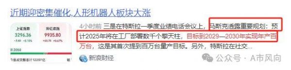 马斯克表示预计2025年将在工厂部署数千个擎天柱,目标到2029-2030年实现年产百万台,这是其首次提到百万台量产目标。