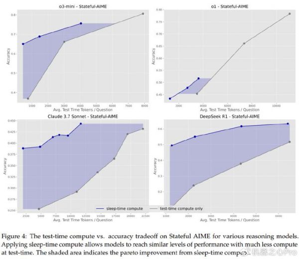 图 4 展示了不同模型在 Stateful AIME 数据集上的结果。我们看到,应用睡眠时间计算后,测试时间和准确率都发生了显著的帕累托偏移,但 o1 除外,它的增益有限。