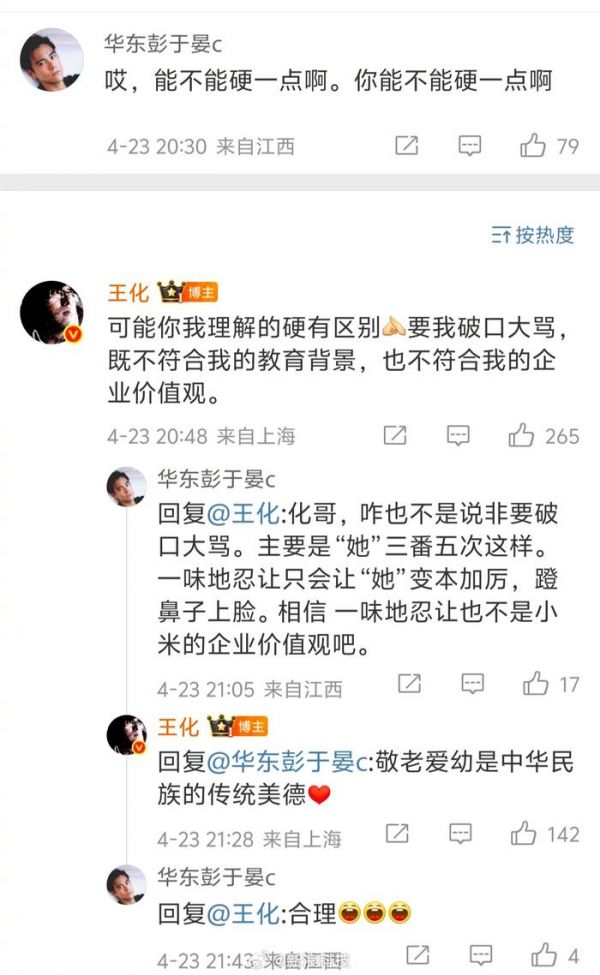 对此,王化回复表示,“可能你我理解的硬有区别,要我破口大骂,既不符合我的教育背景,也不符合我的企业价值观。”并进一步回复称,“敬老爱幼是中华民族的传统美德。”