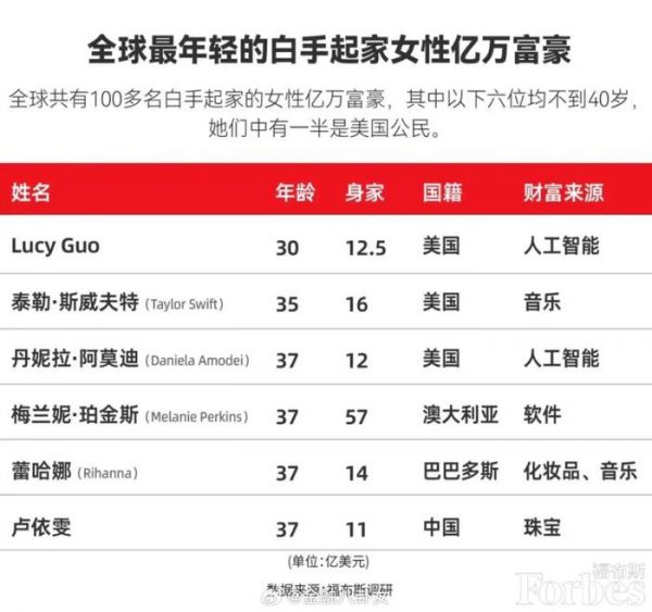 【AI造富!#30岁华裔将成最年轻白手起家女富豪#身家估计12.5亿美元[并不简单]】 1994年出生的郭露西,她大学辍学,十几岁就靠编程赚钱!她是全球40岁以下仅6位白手起家女亿万富豪之一,也是唯一一位在已退出创办公司后仍靠股份跻身亿万富豪行列的女性。