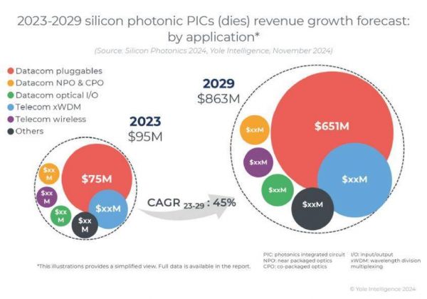 据Yole报告,2023 年,硅基 PIC(芯片)市场规模为 9500 万美元,预计到 2029 年将增长至 8.63 亿美元以上,复合年增长率 (CAGR2023-2029) 为 45%。