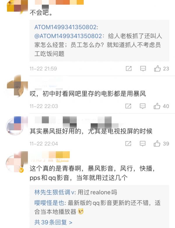 “这个真的是青春啊,暴风影音、风行、快播、pps和qq影音,当年就用过这几个”,“以前初中的时候,都是下载电影然后用暴风影音打开看的啊。”网友们纷纷对暴风影音表示怀念。
