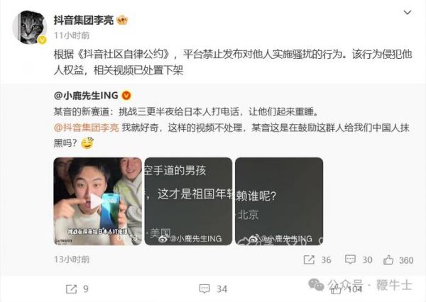 微博博主“小鹿先生ING”转发了相关视频,并喊话抖音集团副总裁李亮:“我就好奇,这样的视频不处理,某音这是在鼓励这群人给我们中国人抹黑吗?”