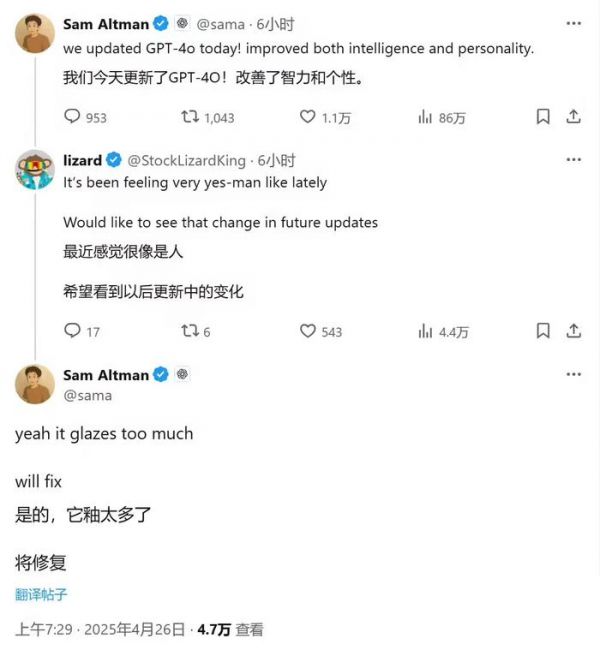 当地时间4月25日,OpenAI CEO奥特曼在社交媒体上表示,已经升级了GPT-4o模型,目前在智能和个性两方面都有所提升。