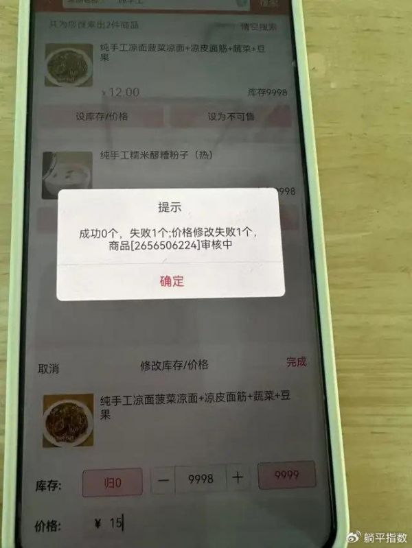 部分商家提供的视频显示,有商家对一份原价25元的酱油蛋炒饭进行价格调整时,修改为26元提交失败,试着输入24元则能保存成功,当想再恢复为25元再次提交时,又显示失败,原本25元的价格则不能再恢复。也有商家发现,在不知情情况下被参加了平台补贴活动,且报名后无法自己取消。
