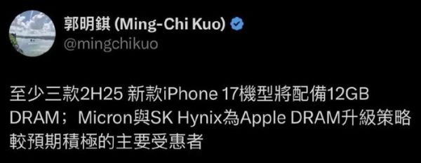 此外,郭明錤还表示,苹果正在评估是否为iPhone 17标准版也配备12GB内存,预计到下个月就会有最终定论。
