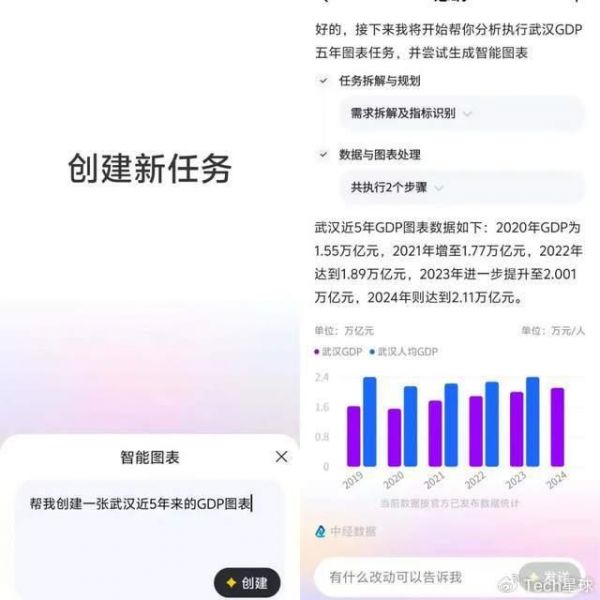 用户可以通过回放、试一试,以及创建新任务等方式,体验全流程任务托管。譬如,选择创建新任务后,点击智慧图表,在输入一段帮我创建一张武汉近5年来的GDP图表,不到20秒,即可生成一张GDP和人均GDP的条形图。