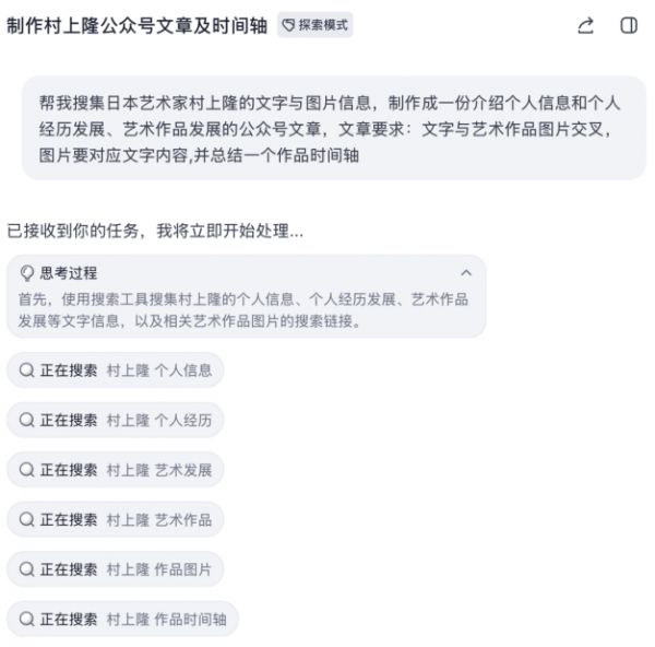 在实际测试中,它对提示词的遵循能力优异,能够自动检索网页、制作可视化报告,流程流畅几乎没有卡顿,给出了一份完整的、规规矩矩的文字报告以及作品时间轴。