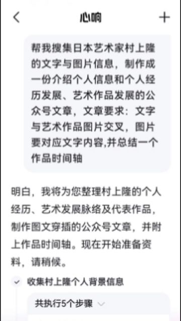我们让扣子空间作为一位艺术类型公众号撰稿者,搜集日本艺术家的文字与图片信息,制作成一份文字与艺术作品图片交叉的稿件。