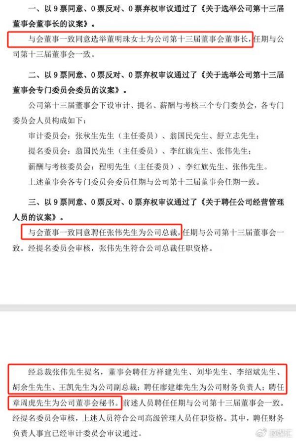 近日,格力发布公告称,董明珠当选公司第十三届董事会董事长;张伟当选总裁,经其提名,董事会聘任方祥建、刘华、李绍斌、胡余生、王凯为副总裁,聘任廖建雄为财务负责人,聘任章周虎为董事会秘书。