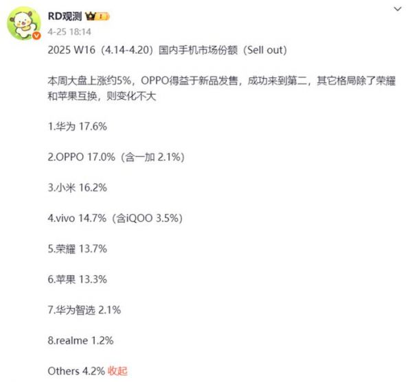 其中华为以17.6%的份额稳居榜首,OPPO凭借Find系列新机的强势表现首次超越小米,以17.0%的份额跃升至第二位。
