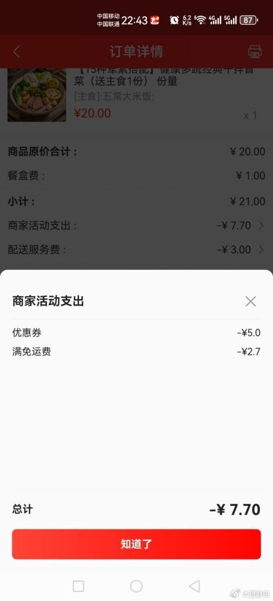 此外,有商家还晒出了京东系统后台的活动页面,显示一份20元的外卖,商家活动支出包括优惠券5元以及满免运费2.7元,商家承担的补贴比例为40%左右。
