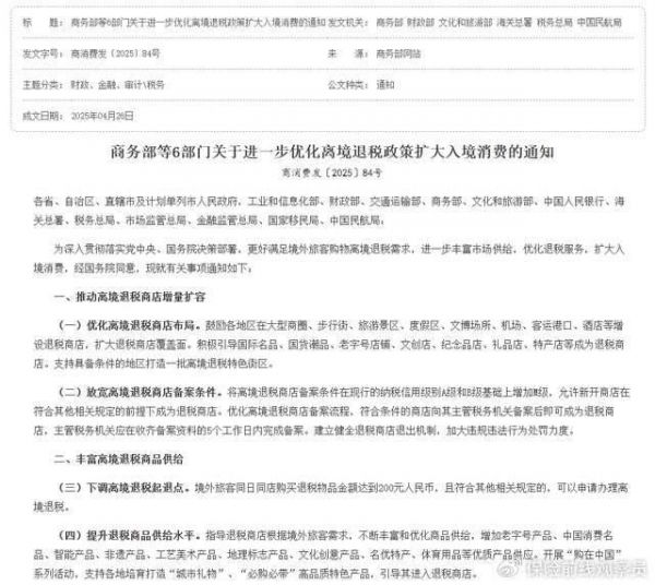 昨晚,商务部等六部门发布进一步优化离境退税政策扩大入境消费的通知。