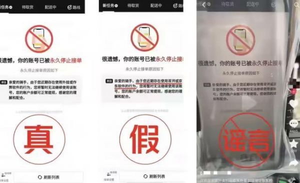 声明提到,(官方先前)澄清“去其他平台跑单会被美团永久封号”的谣言后,社交平台上依旧出现了骑手 App 显示“永久停止接单原因为:存在使用双开或京东软件的行为”的谣言图片。