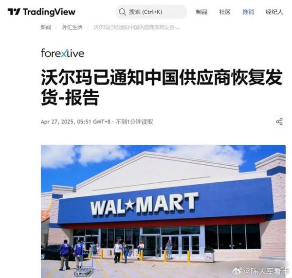 上周日(4月27日),美国大型零售商沃尔玛,通知中国供应商恢复发货,所有关税由美方(沃尔玛自身)承担。这个消息,得到了广交会上几名沃尔玛中国供应商的确认,但沃尔玛官方目前并没有就此消息回应。