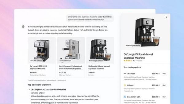 ▲在ChatGPT内搜索咖啡机然而,用户无法在ChatGPT内完成结账,所有交易需重定向至商家网站。这一设计选择确保了平台的专注性,同时依赖外部电商生态。
