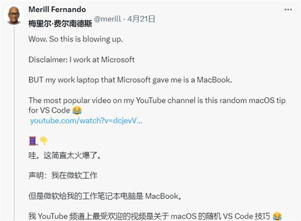 他提到,自己所使用的MacBook正是微软发放的工作设备,此外他还拥有一台Mac Studio,用于运营播客、newsletter和开源项目。