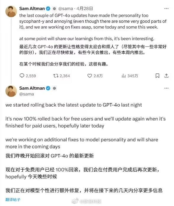 奥特曼:GPT4o过于奉承问题逐渐修复