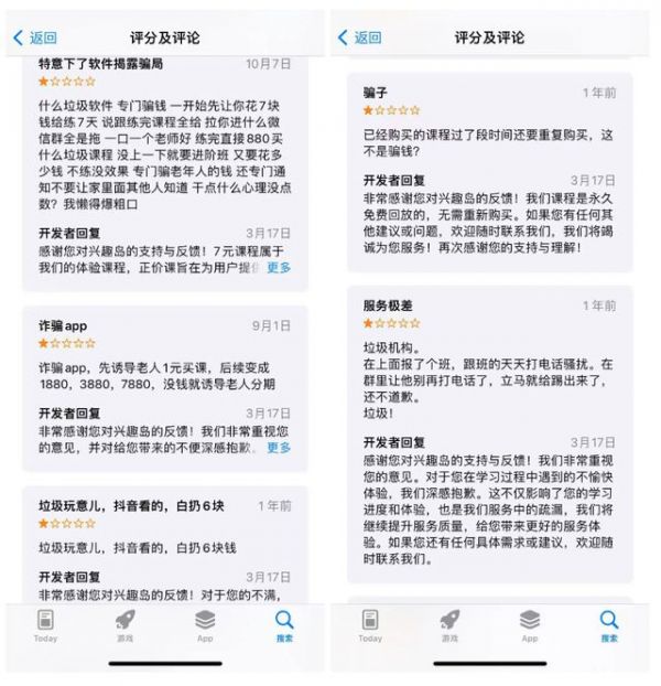 图注:苹果应用商店中,兴趣岛App的部分用户评论,吐槽诱导、骗老年入买课。