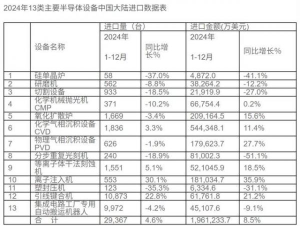 今年2月,海关统计数据在线查询平台公布了2024年13类主要半导体设备进口29367台,同比增加4.6%,进口金额196.12亿美元,同比增长8.5%。