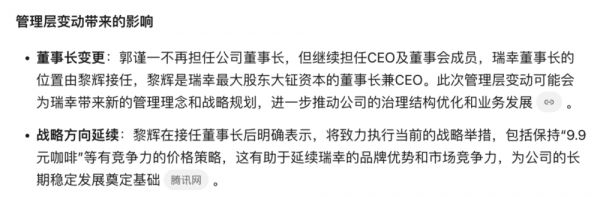 另外,由于财新网的文章重点提到了瑞幸的管理层变更及后续影响,kimi 的财报分析也在最后段落增加了相关内容,让分析的段落格式和财新的内容基本保持一致。