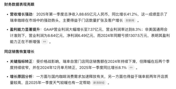内容方面,调整了提示词后新的内容的确更加扎实,在数据之外还会对内容进行进一步的概括和总结,比如在谈及瑞幸的财务数据时,会结合历史同期的数据,总结出“盈利能力正在不断增强”的观点。