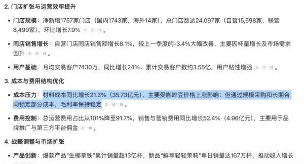 在分析的细致程度上也是 DeepSeek 更胜一筹。比如在分析成本压力时,DeepSeek 会提到和咖啡豆的成本上涨有关,而 kimi 只用一句“成本有所上升”简单带过。
