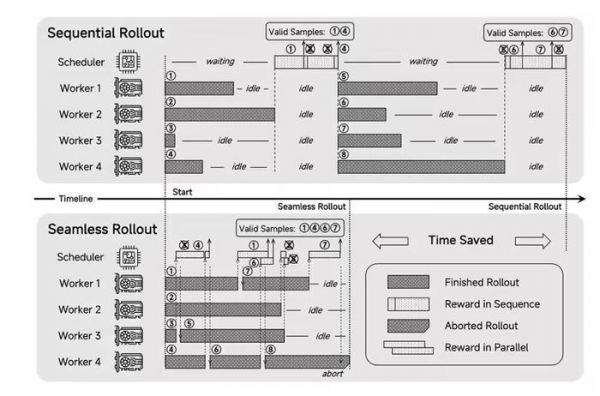 框架:设计了 Seamless Rollout 系统,使得 RL 训练加速 2.29 倍,验证加速 1.96 倍。