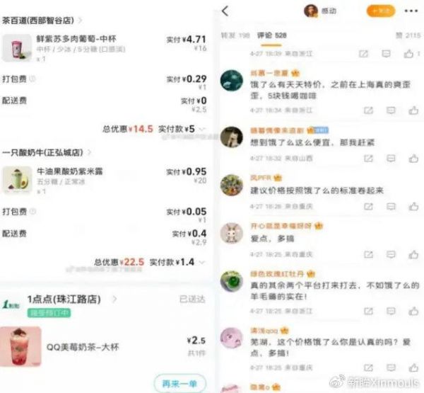 “真便宜。”近日不少用户在社交媒体上晒出饿了么外卖截图,以往十几块一杯的奶茶现在只要几块钱,二十多块的一顿便餐优惠接近总价一半,以至于很多网友直呼“饿了么现在便宜到不敢点”、“点个外卖都要货比三家了”。