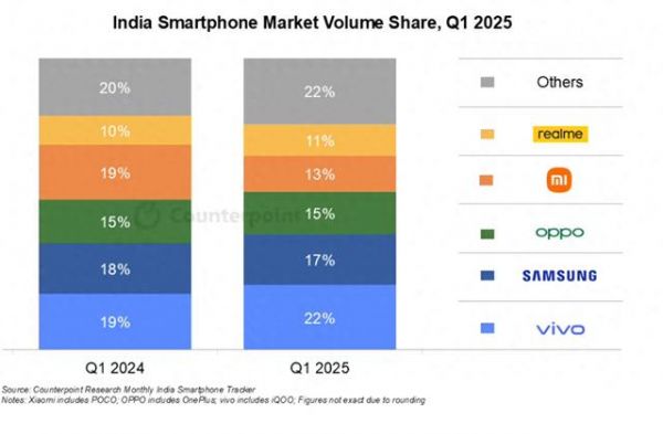 2025印度智能手机市场一季度出货量,vivo领跑