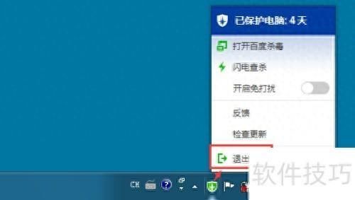 1、 卸载百度杀毒前,需先退出程序。右键点击桌面右下角图标,选择退出选项,所示。